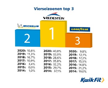 Vredestein blijft marktleider in zowel de winterbanden als de vierseizoenenbanden. Het wegdekaandeel van de vierseizoenbanden is ook nu weer toegenomen, totaal 13,3 procent. Vredestein is de absolute marktleider in vierseizoenbanden met 40,8 procent en laat zelfs een forse groei zien ten opzichte van vorig jaar (32,0 procent). Ze hebben daarmee een ruime voorsprong op de nummer 2 Michelin met 10,8 procent. “Dat is voor ons geen verrassing, want we zien dit ook terug in onze verkoopgegevens”, aldus Arjan van der Meer, Marketing Director van KwikFit.
